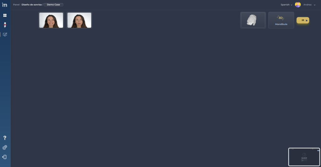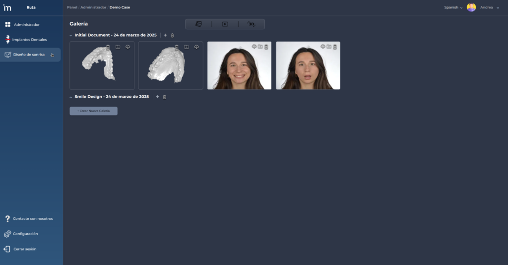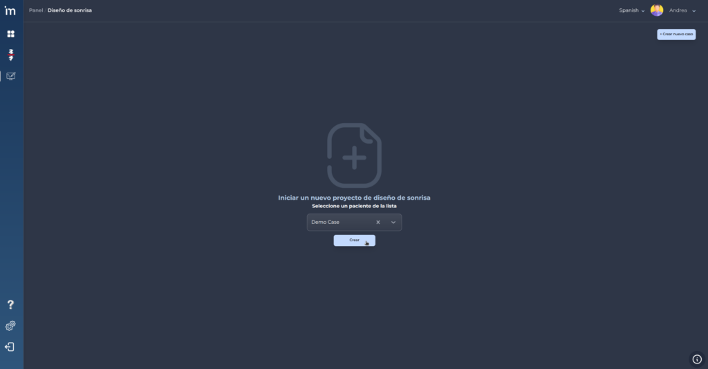 Tras crear un caso en el Administrador y subir los archivos del paciente a la galería se puede empezar el caso. Para ello hay que hacer clic en Diseño de sonrisa, situado en el menú de la izquierda.