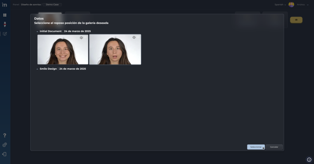 A continuación se han de seleccionar las imágenes de sonrisa y reposo y los archivos STL. Para conseguir unos resultados óptimos se recomienda subir una imagen de sonrisa del paciente, una de reposo y un STL de la dentadura superior.