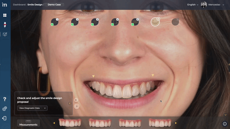 En la parte inferior hay una librería con diferentes dentaduras que pueden aplicarse a la nueva sonrisa propuesta. Sobre la dentadura propuesta hay una línea amarilla (guía del arco) que permite ajustar la dentadura sobre el paciente. Para ajustar la posición de los dientes hay que hacer clic sobre uno de los triángulos amarillos que hay en los extremos de la línea. Aparecerán los dientes marcados de color blanco y manteniendo clic izquierdo se puede ajustar el arco de los dientes.