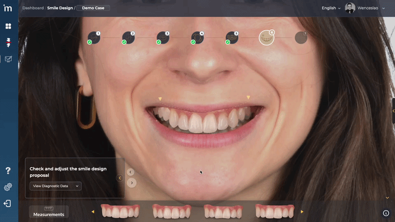 También permite conotrolar el brillo de la sonrisa diseñada con la barra deslizante Diseño de sonrisa y el tono de los dientes de más cálido a más blanco con la barra deslizante de Color de los dientes.