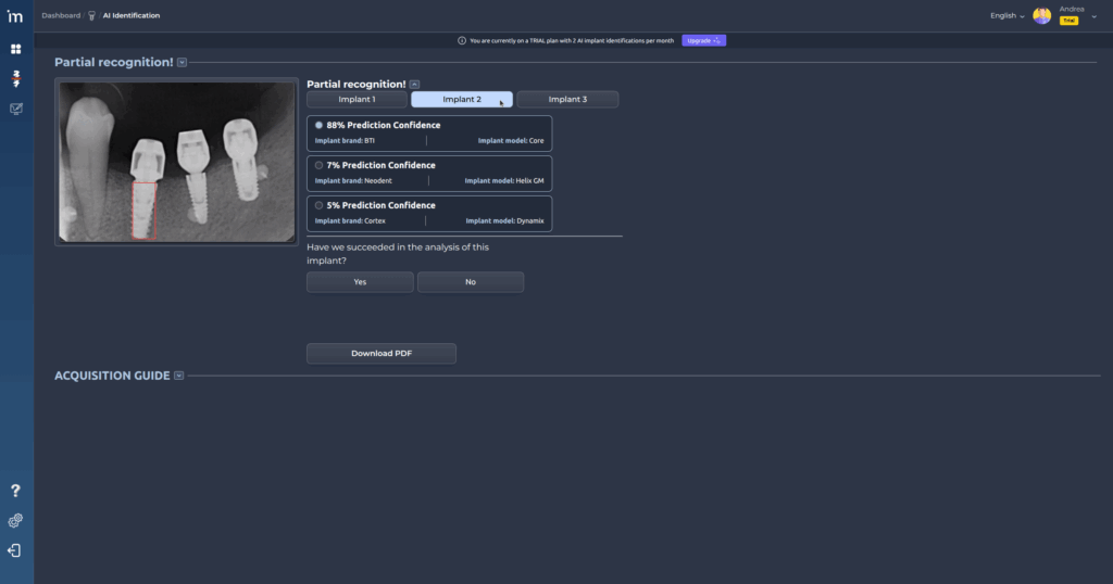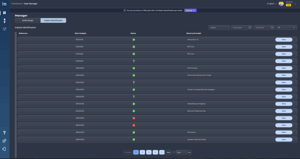 • Brand and Model: name of the implant detected in the image (for example, Straumann TL, BTI Core, etc.).