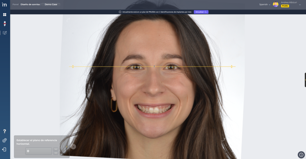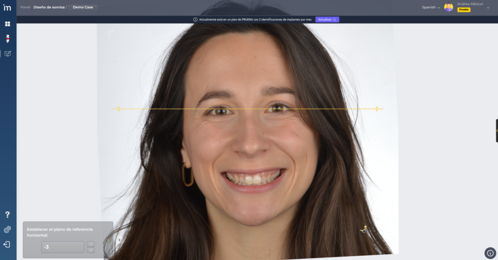 En esta primera pantalla por defecto se estimará la línea bipupilar como plano de referencia horizontal. Sin embargo la línea horizontal puede ajustarse manualmente para alinearla con el plano de preferencia que se desee. Para ello, se ha de situar el ratón sobre la línea, y manteniendo clic con el botón izquierdo, arrastrar la línea a la posición deseada.