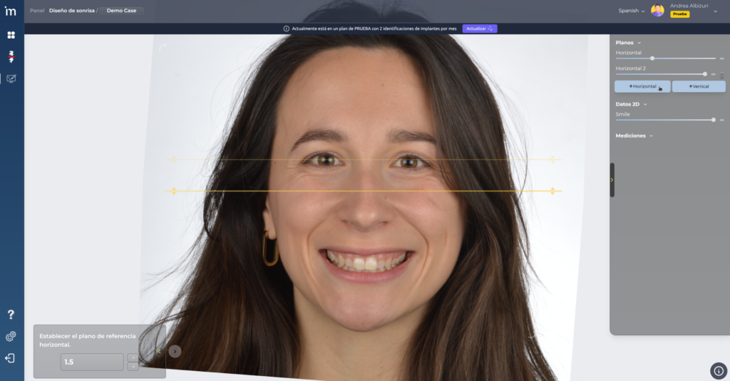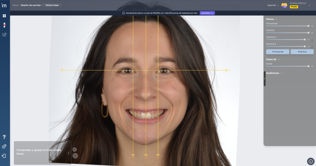 Al pasar a la siguiente pantalla aparecerá la línea media facial. Al igual que la línea horizontal, esta línea puede desplazarse, y haciendo clic en +Vertical del menú desplegable de la derecha, se pueden crear nuevas líneas verticales.