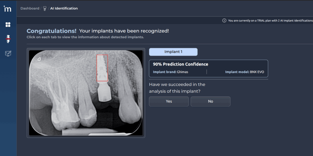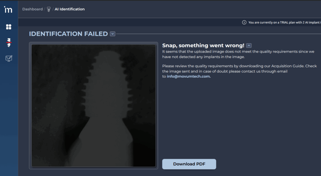 On the other hand, if the image does not meet the required quality criteria, the implant cannot be detected or classified, and an error message will be displayed.