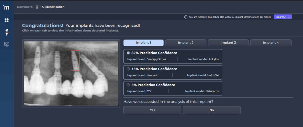 For each implant, the system indicates the confidence level associated with the identification of its make and model.