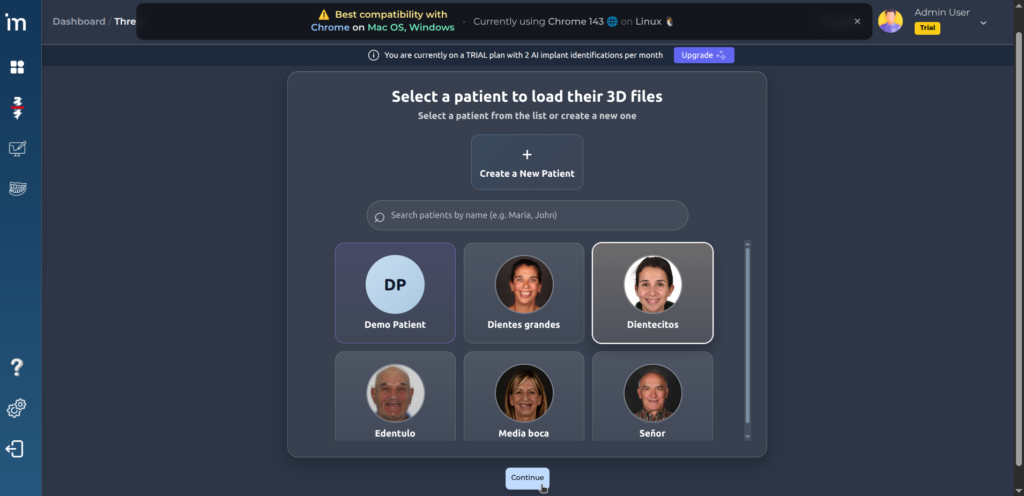 2️⃣ Seleciona un paciente y haz clic en Continue. Si lo deseas, o si todavía no tienes ningún paciente puedes crear uno nuevo haciendo clic en Crear un nuevo paciente.
