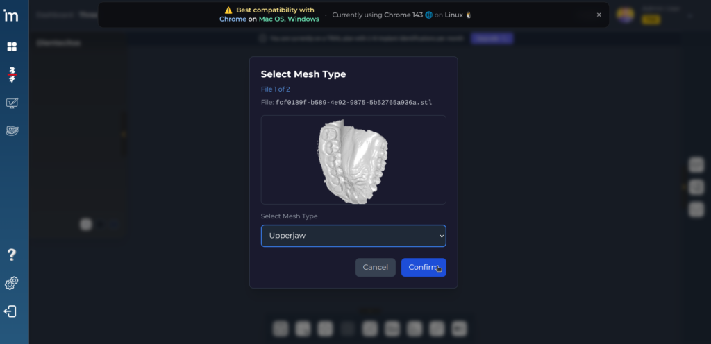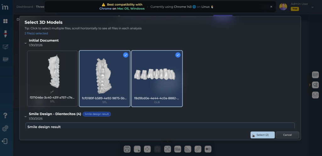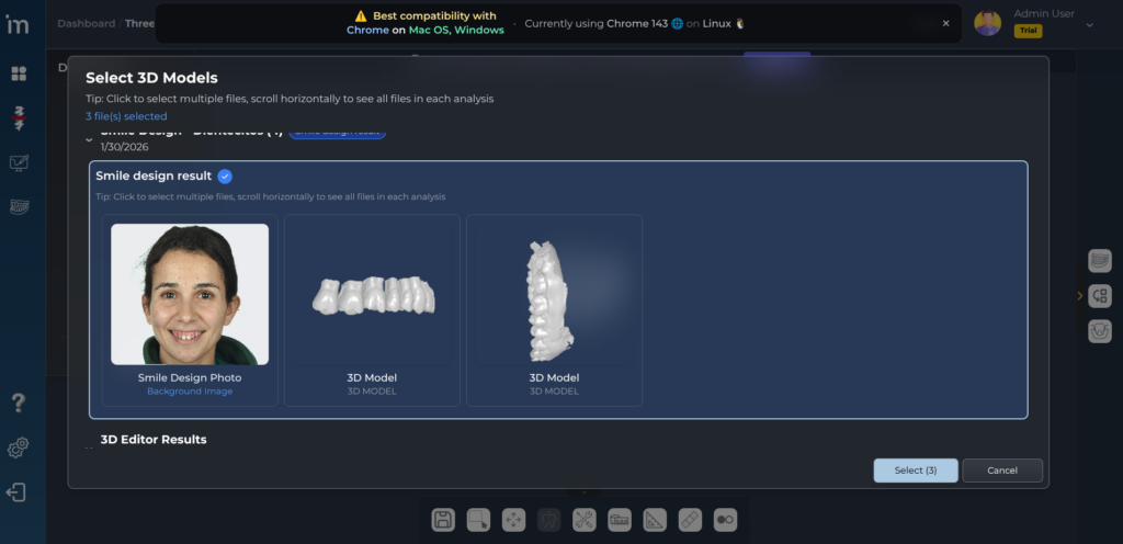 2️⃣ Este botón lleva directamente a la carga de archivos 3D del paciente. Por defecto selecciona el estudio de Smile design que incluye el upperjaw, el wax up resultado y la fotografía de sonrisa del paciente.